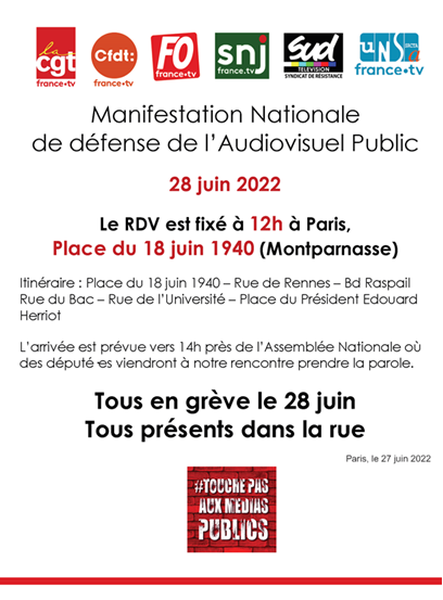 Suppression de la redevance : Manifestation Nationale de défense de l’Audiovisuel Public du mardi 28 juin 2022